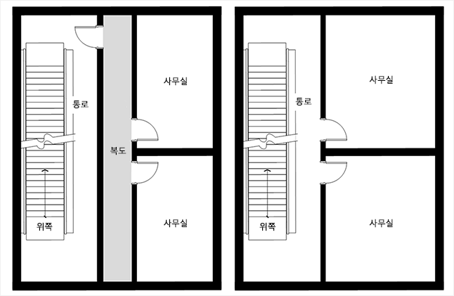 일방향 계단의 직통계단 인정 여부: 직통계단(오른쪽), 직통계단 아님(왼쪽) ⓒ이재인 * 계단을 일방향으로 계획한 경우 실내의 다른 부분인 복도 및 거실 등을 거치지 않고 피난할 수 있는 계단일때 직통계단으로