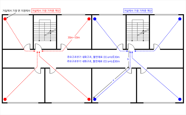 보행거리 산정의 개념 ⓒ이재인 직통계단의 주요 취지는 막힘없는 대피를 위한 통로를 마련해 주기 위한것이다.