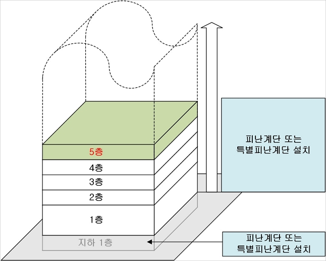 피난계단 또는 특별피난계단 구조 설치 대상 ⓒ이재인 *5층 이상 또는 지하 2층 이하인 층에 설치하는 직통계단은 피난계단 또는 특별피난계단으로 설치하여야 한다.
