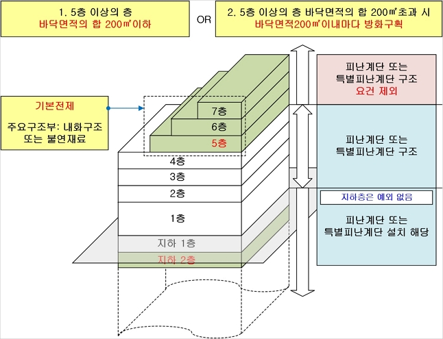피난용 계단의 종류와 구조요건 ⓒ이재인 2. 피난계단 또는 특별피난계단의 구조로 해야 하는 대상
