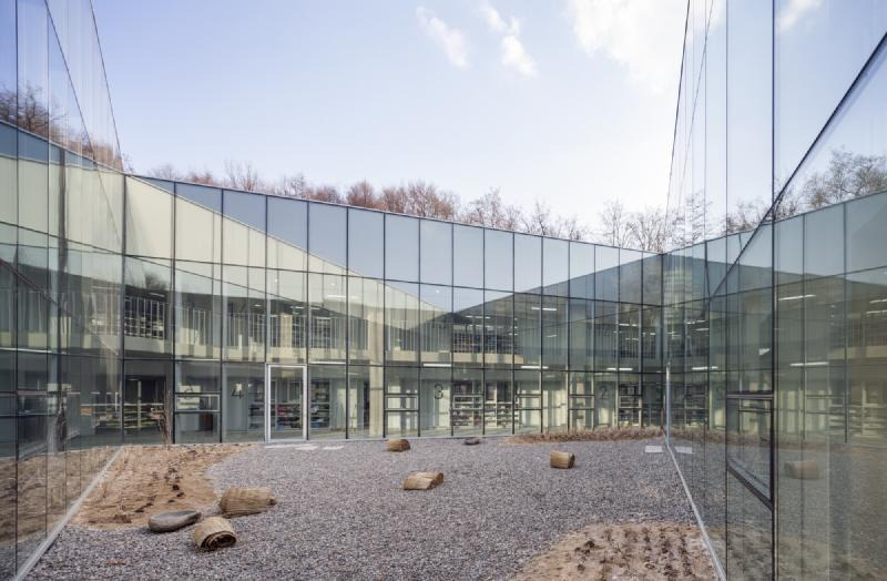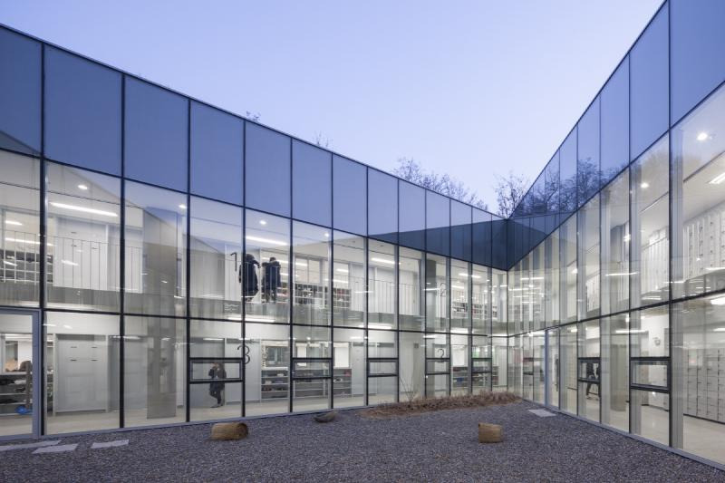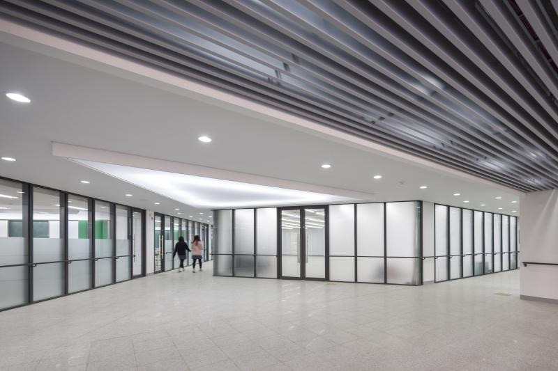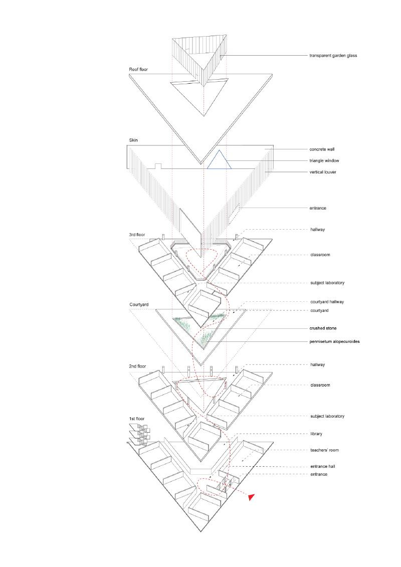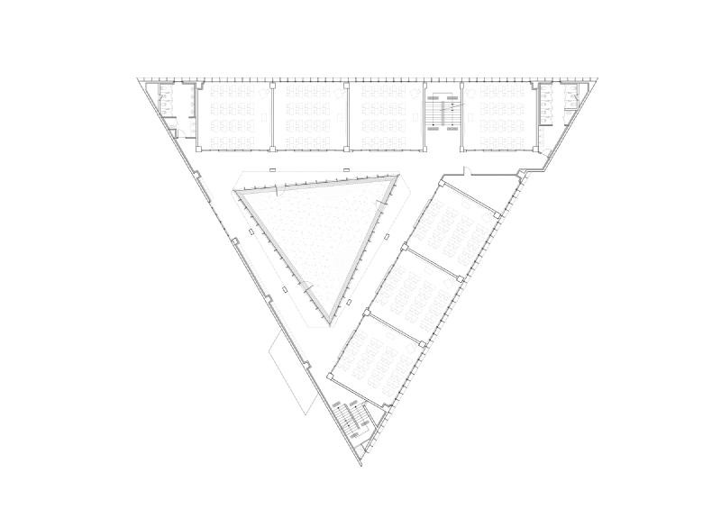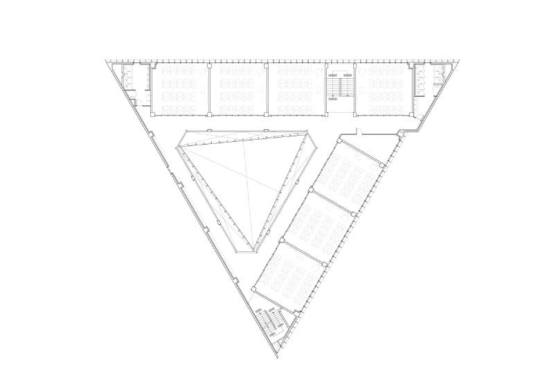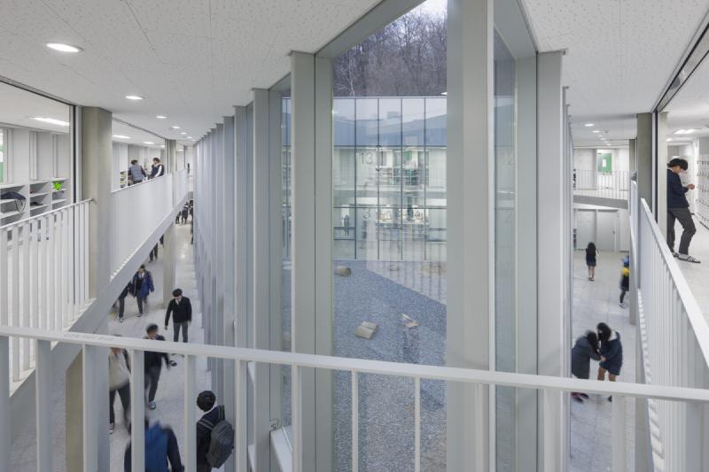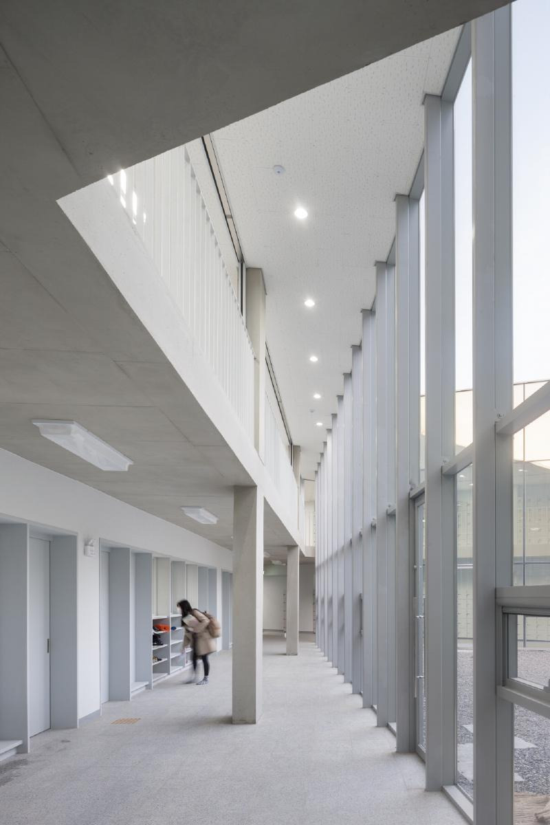 파사드의 세 면이 외부와의 관계를 조율한다면, 내부는 정반대입니다. 2층과 3층의 교실을 중심으로 열린 중정이 중심에 놓이고, 이 중정은 각기 다른 각도로 배치된 투명한 내부 삼각형 벽에 의해 또 다른 삼각형 공간으로 분할됩니다. 이 투명한 구조는 상층과 하층을 수직으로 연결하며, 빛과 바람, 시선이 흐르는 유기적인 공간을 만들어냅니다.