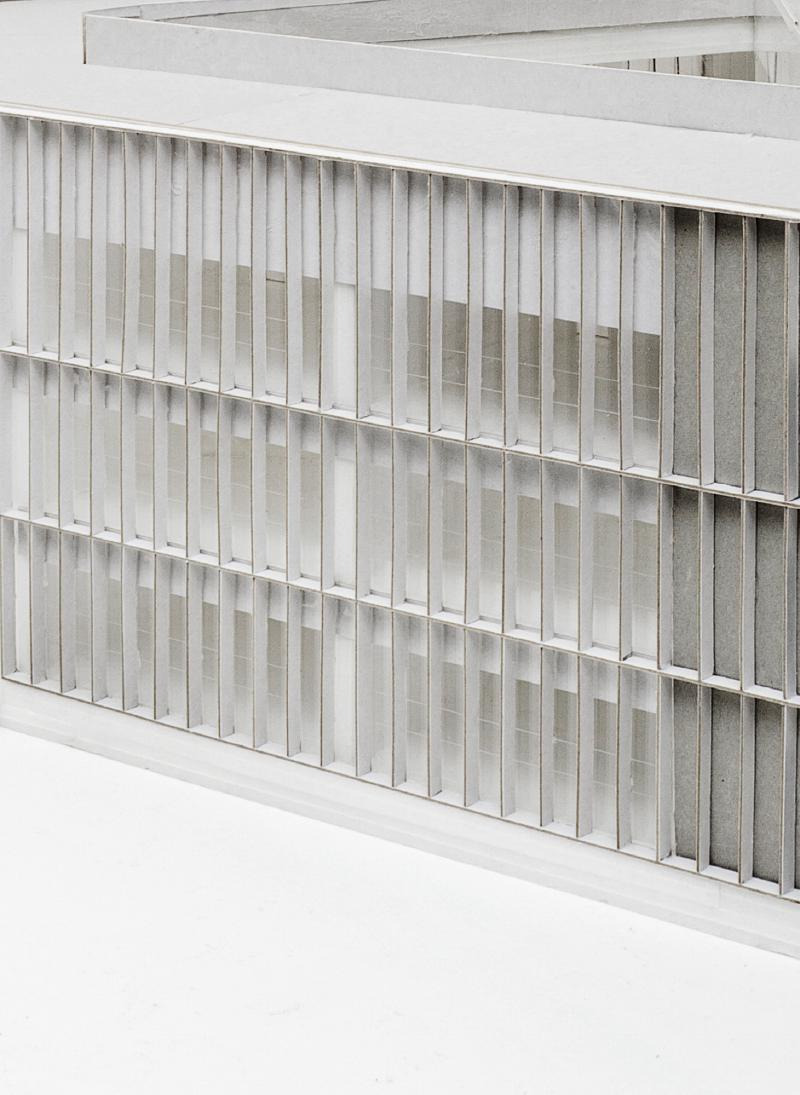 트라이앵글 스쿨은 그 경계를 둘러싼 세 가지 조건에서 출발합니다. 북쪽은 운동장, 동쪽은 언덕, 서쪽은 기존 중학교 건물. 서로 다른 성격의 외부 조건은 각기 다른立面(elevation)을 만들어냅니다. 북쪽은 투명한 루버 파사드로 열림을, 동쪽은 지형에 순응하는 절제된 개방을, 서쪽은 단단히 닫힌 콘크리트 벽으로 기존 중학교와의 기능적 독립을 강조합니다. 그중 단 하나의 삼각형 창은 내부 공간의 기하를 암시하는 장치로 작동합니다.