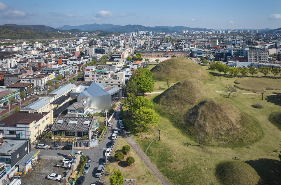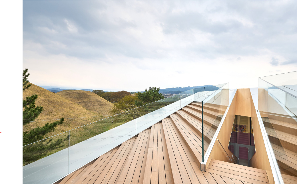 - 반사체 활용: 유리 파사드와 내부 미러 디테일을 통해, 고분과 주변 경관이 시시각각 변주되며 관람객의 이동에 따라 새로운 풍경을 선사합니다.