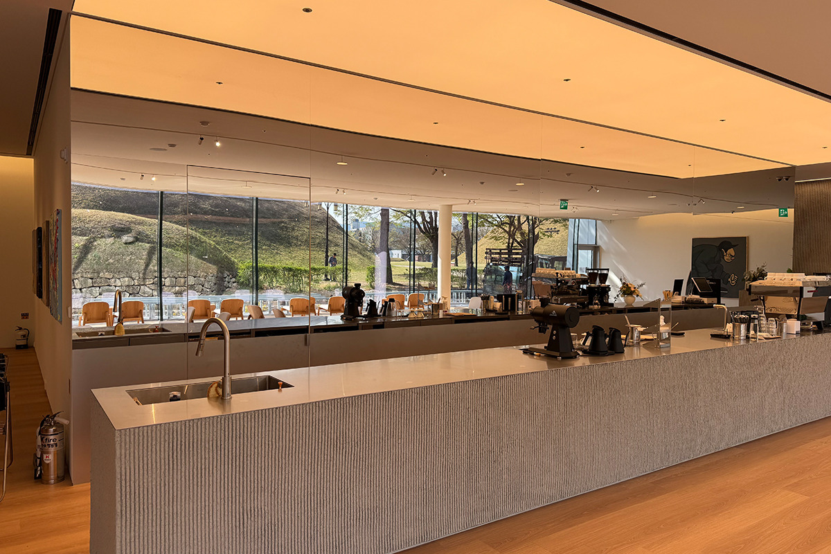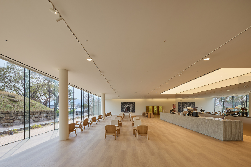 - 1층 카페 앞: 수평으로 정렬된 유리 파사드를 통해 바라보는 고분은, 평평한 천장 라인과 함께 균일하고 고요한 파노라마를 이룹니다.