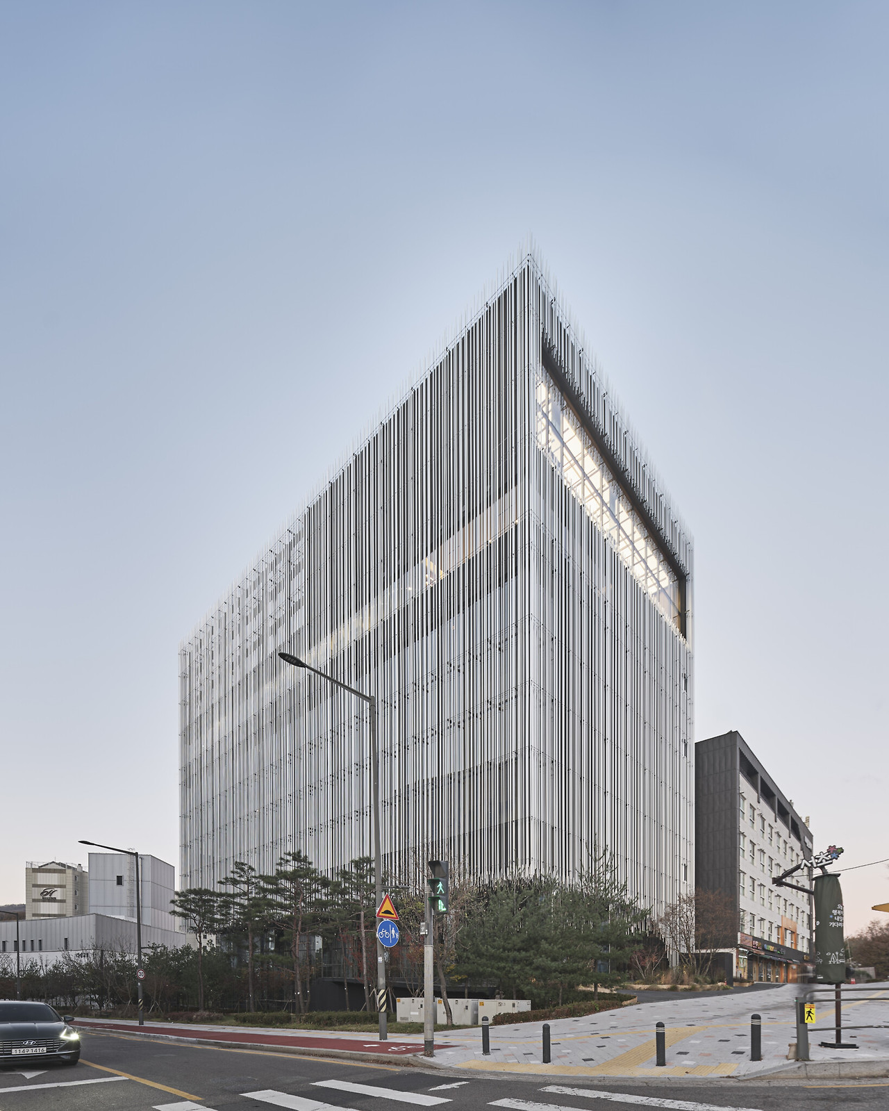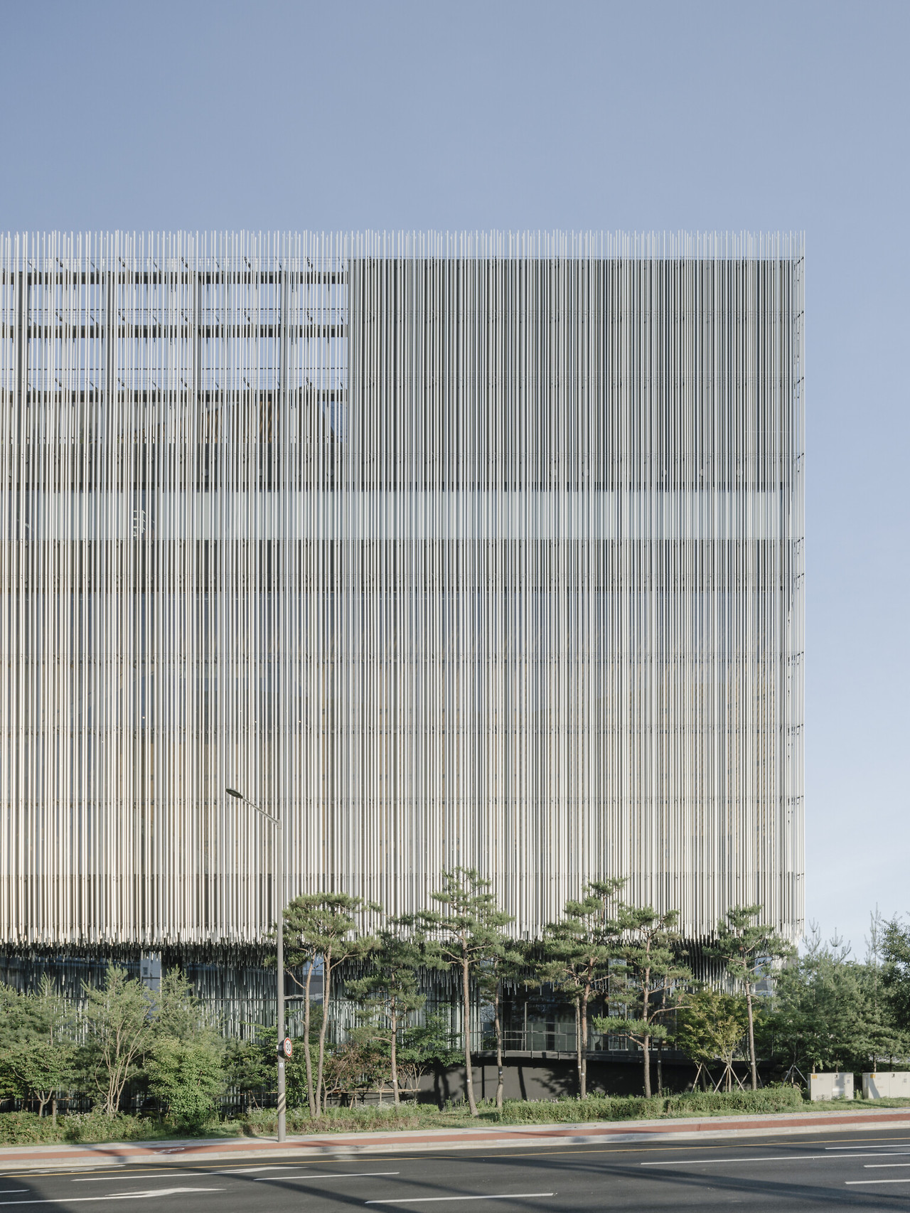 자연으로 스며드는 입면, 계곡을 닮은 진입부- 알루미늄 파사드는 무작위로 배치된 파이프가 시간과 계절, 빛에 따라 색을 달리하며 살아 있는 입면을 만든다. 아노다이징 마감으로 섬세한 반사율을 조율했고, 얇은 파이프의 두께와 밀도 또한 현악기의 줄을 연상케 하며 사운드와 리듬감을 공간에 부여한다.