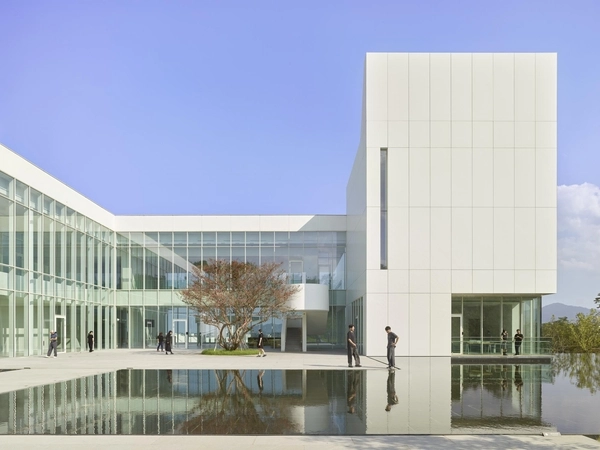 - 외장재: 화이트 노출콘크리트와 알루미늄 커튼월을 조합해 고요하면서도 명료한 인상을 줍니다.