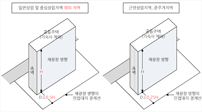 건축물의 높이 10m이상 : 건축물 높이의 1/2이상 이격채광 이격 공동주택 창문이 있는 면에서