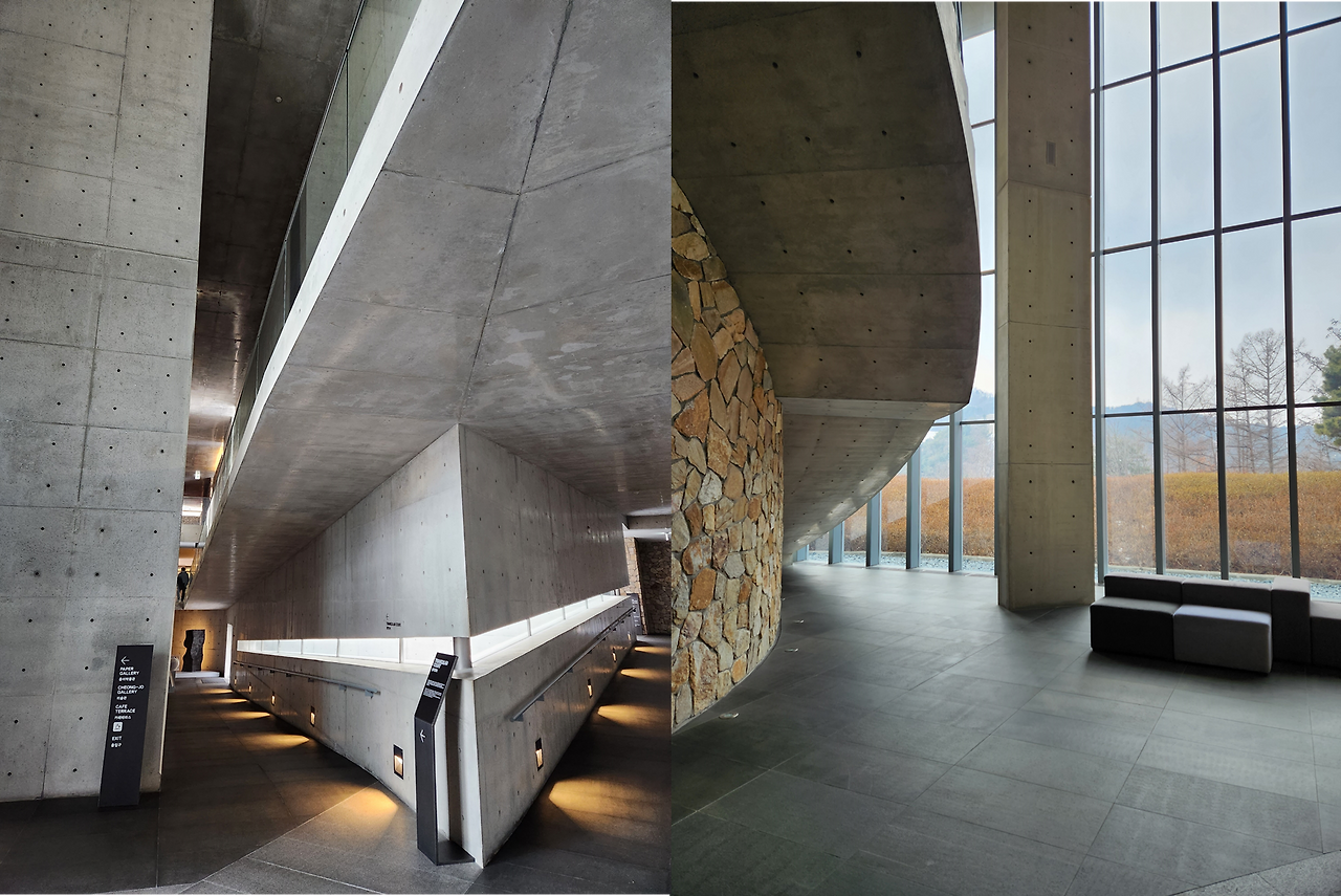 - 콘크리트, 물, 석재, 유리를 사용한 건물들은 각각의 전시동, 명상관, 워터가든, 스톤가든으로 나뉘며 자연 속의 조형물처럼 자리를 잡는다.