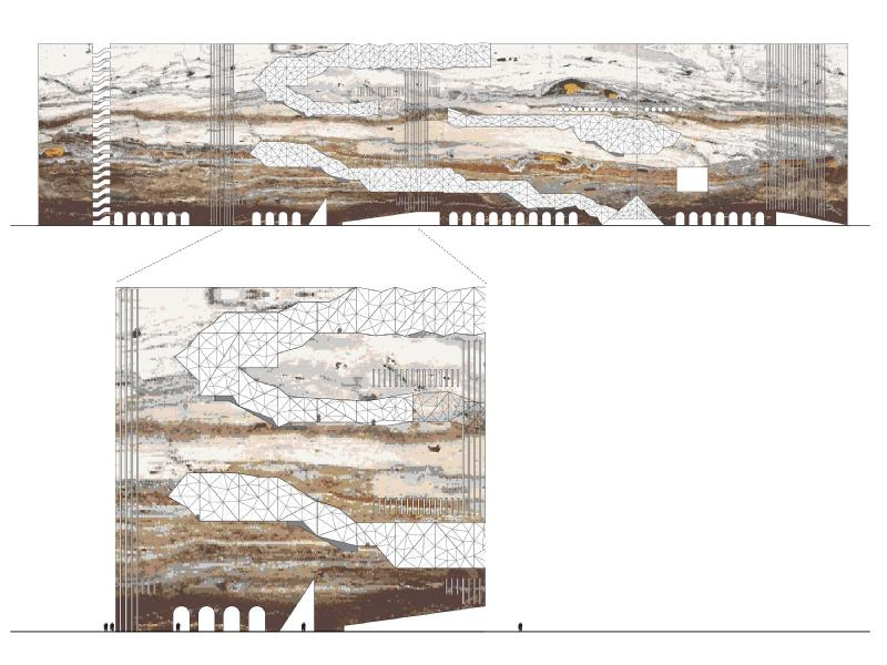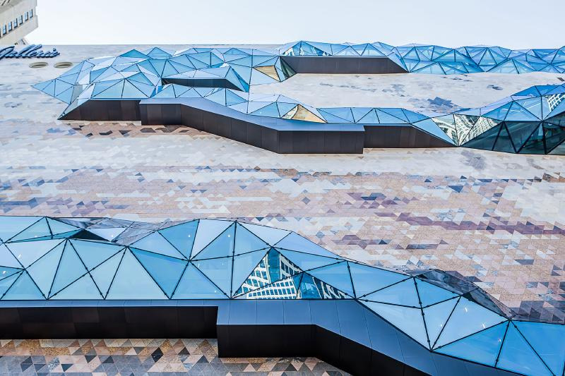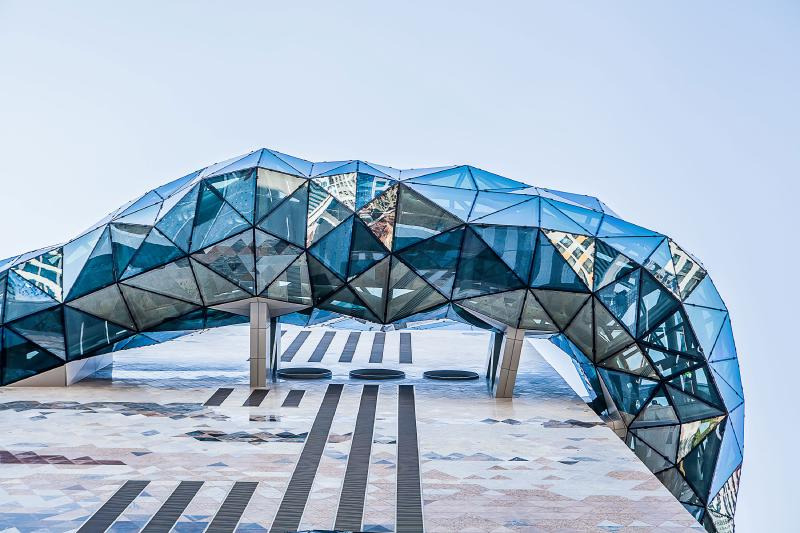 - 다면체 유리 파사드는 돌과의 강렬한 대비를 이루며 내부 활동을 도시로 드러낸다.