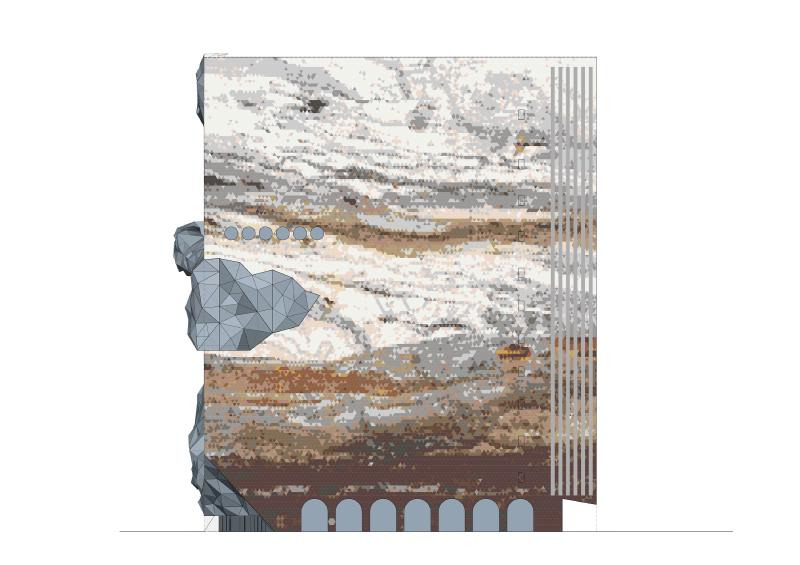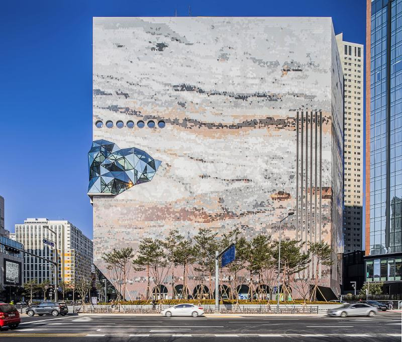 - 모자이크 석재 파사드는 수원 광교호수공원의 자연을 닮았다. 부정형의 돌 조각들이 결합된 입면은 도시 속에서 자연의 질서를 되살리는 듯하며, 주변 풍경과 조화를 이루는 거대한 자연 덩어리로 기능한다.
