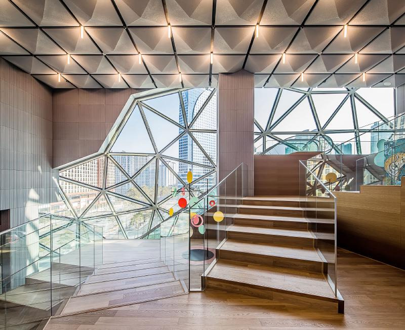 - 외부에서는 백화점 속 문화 콘텐츠가 엿보이고, 내부에서는 광교의 도심과 호수공원의 풍경을 새롭게 조망할 수 있는 시선의 교차점을 제공한다.