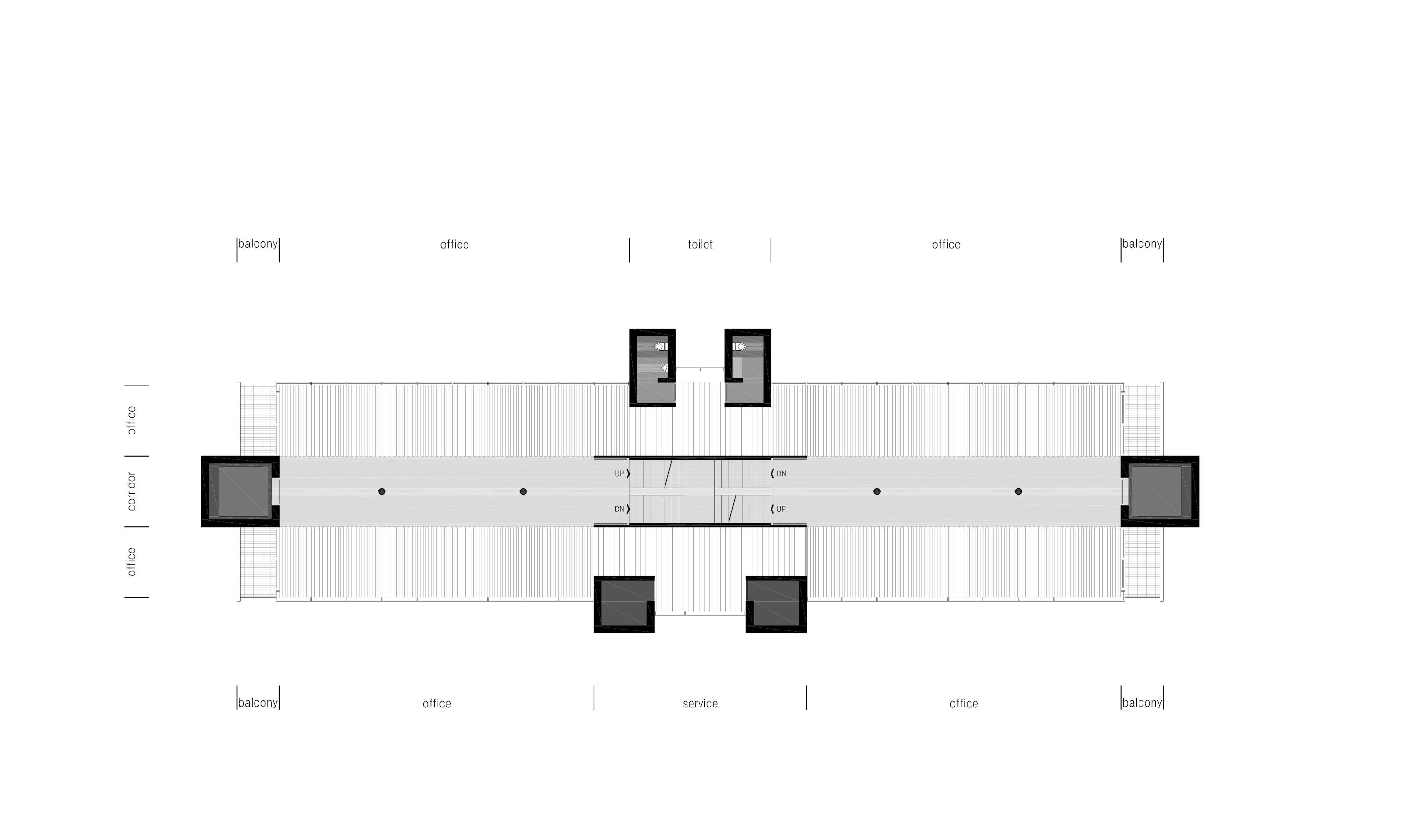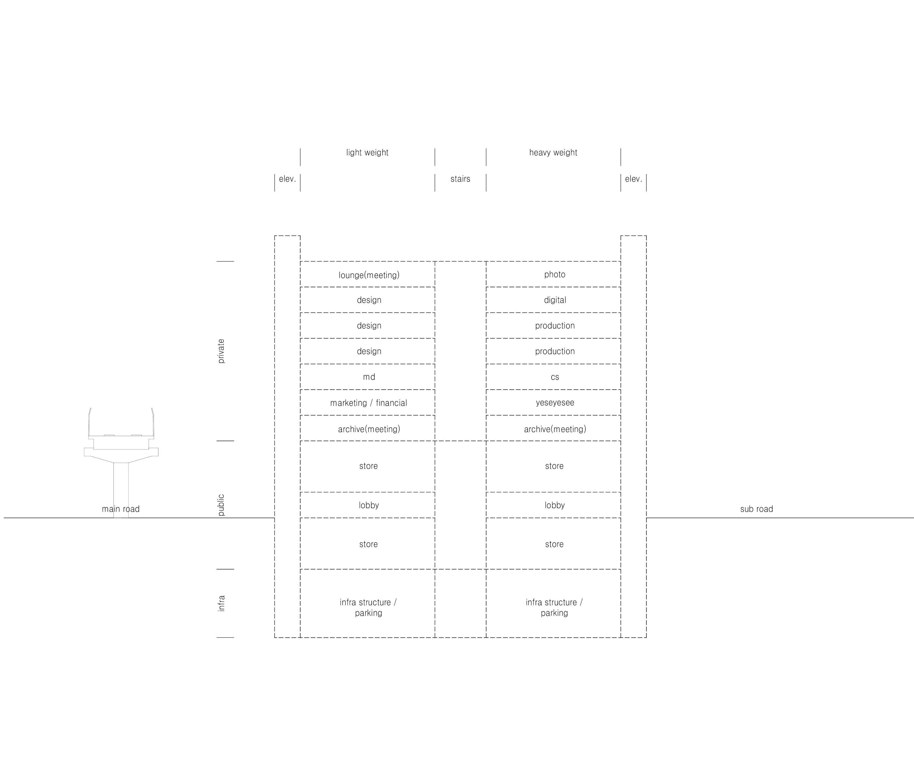 좁고 긴 대지에 맞춰, 많은 설계안이 중심 코어 혹은 측면 코어 방식 중 하나를 택합니다. 하지만 디스이즈네버댓의 사옥은 이 익숙한 양자택일을 거부합니다. 중심에 가위계단을 배치하고, 양 끝에 엘리베이터를 둔 복합 코어 구조를 통해 '막힘 없는 수직 순환'을 실현합니다.